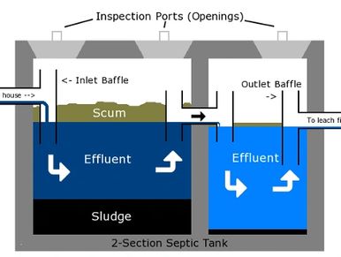 1. Septic tankWastewater flows from the house into a buried, watertight tank made of concrete, fiberglass, or polyethylene. The tank separates the wastewater into three layers: